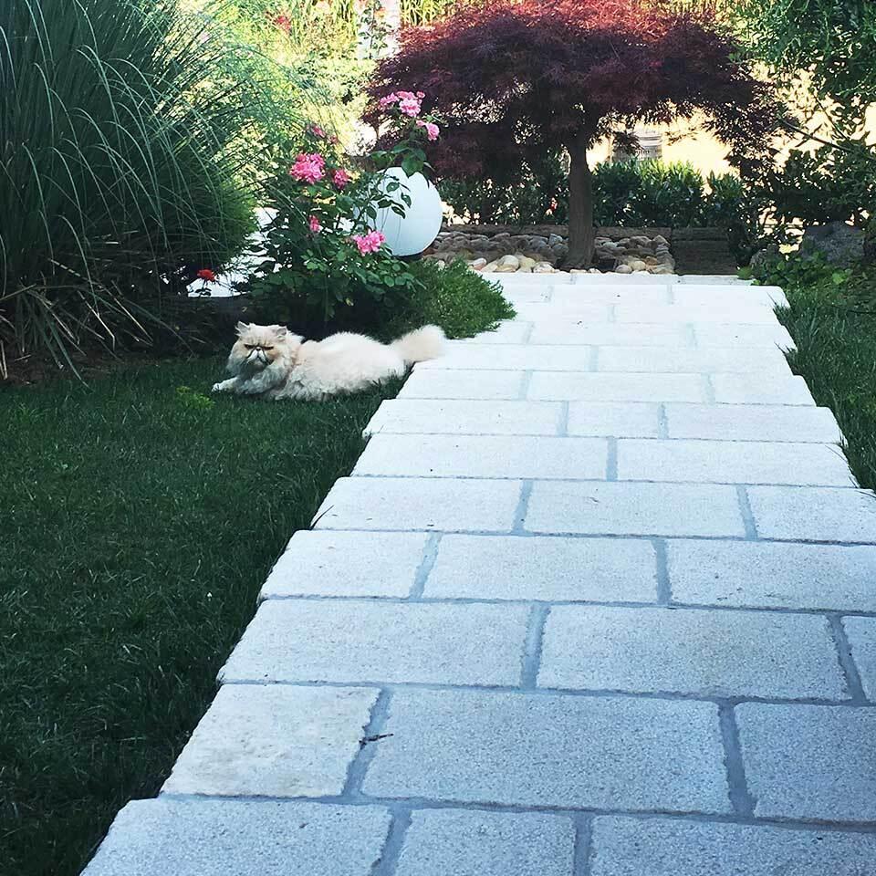 Il pavimento esterno in pietra di quest'abitazione è stato realizzato con la pietra naturale di Trani, resistente all’usura del tempo ed agli agenti atmosferici, che si presenta qui nella colorazione del bianco tendente al crema, tonalità chiara e neutra che non stanca nel tempo e cnferisce maggiore luminosità al giardino.